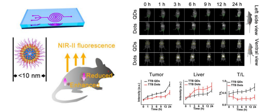 The second paper published in Angew Chem Int Ed. was titled “Sub‐10 nm Aggregation‐Induced Emission Quantum Dots Assembled by Microfluidics for Enhanced Tumor‐Targeting and Reduced Retention in the Liver.” AIE dots (AIE dots) obtained by hybridization with phospholipids have been widely used in biomedical imaging. However, the particle size of the AIE dots prepared in this traditional method is usually larger than 25 nm. Due to the interception of the liver, spleen, and other organs, the ideal imaging effect is often difficult to obtain with such large AIE dots.