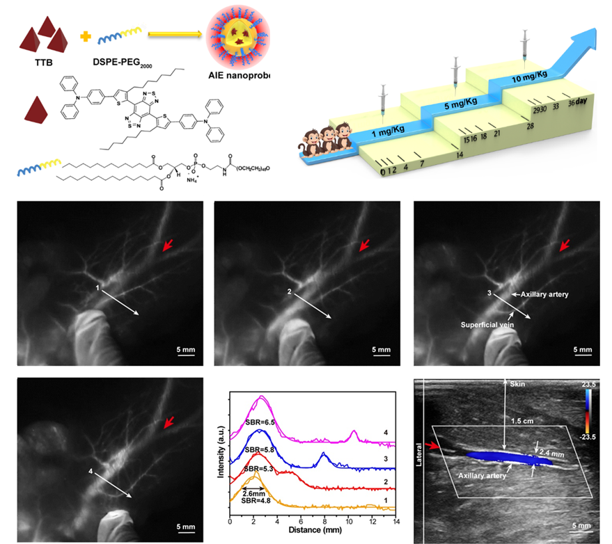 The research team studied the high intravenous injection dose of AIE probes, 30 times the standard clinical dosage in primate blood and histological analysis report. The results showed that the AIE probes were in the normal range after 35 days of metabolism in primates, which proved that the AIE probes were not biologically toxic. The research team also utilized the biological safety and high-brightness optical performance of the AIE probe. They successfully achieved a depth of 1.5cm blood vessel imaging in primates, breaking the current limit of near-infrared two-zone fluorescence imaging at the millimeter level.